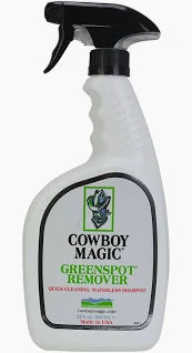 Greenspot Remover Spray by Cowboy Magic is easy to use and formulated to remove manure and urine spots and wet or dried sweat instantly, leaving the newly cleaned spots with a high shine after brushing. It's like having a shower in a bottle for you and your pets!