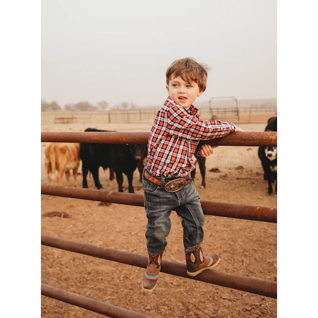 Who doesn’t love Indians and Cowboys?! Our “Maddox” offers both in one stylist boot! The “Maddox” has embroidered red and gold feathers with turquoise arrows and accents making this boot perfect for any boy or girl! Made with real brown leather and made to last!!